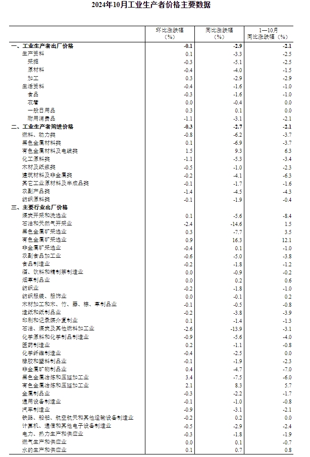 2024年10月份,全国工业生产者出厂价格同比下降2.9%,工业生产者购进价格同比下降2.7%。工业生产者出厂价格环比下降0.1%,工业生产者购进价格环比下降0.3%,降幅均比上月收窄0.5个百分点。1—10月平均,工业生产者出厂价格和购进价格均比上年同期下降2.1%。
