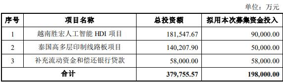 本次向特定对象发行股票拟募集资金总额不超过198,000.00万元,扣除发行费用后的募集资金净额拟投资于越南胜宏人工智能HDI项目、泰国高多层印制线路板项目、补充流动资金和偿还银行贷款。