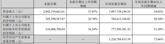 年初至报告期末,公司实现营业收入76.98亿元,同比增长34.02%;归属于上市公司股东的净利润7.65亿元,同比增长30.54%;归属于上市公司股东的扣除非经常性损益的净利润7.78亿元,同比增长33.20%;经营活动产生的现金流量净额为12.27亿元,同比增长72.66%。