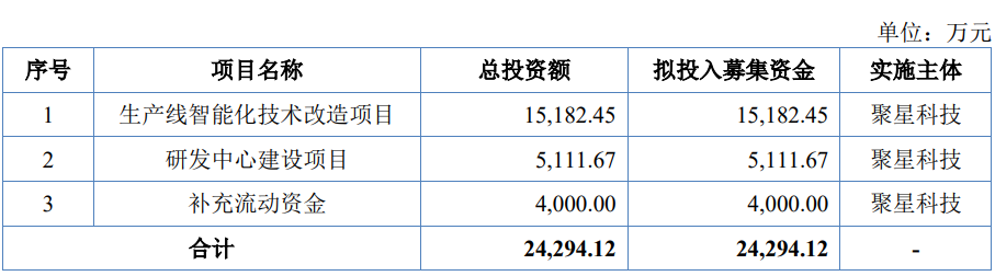 本次发行超额配售选择权行使前,聚星科技募集资金总额为24,268.75万元,扣除发行费用后募集资金净额为21,036.07万元。公司募集资金净额比原计划少3,258.05万元。聚星科技2024年10月25日披露的招股书显示,公司拟募集资金24,294.12万元,用于生产线智能化技术改造项目、研发中心建设项目和补充流动资金。