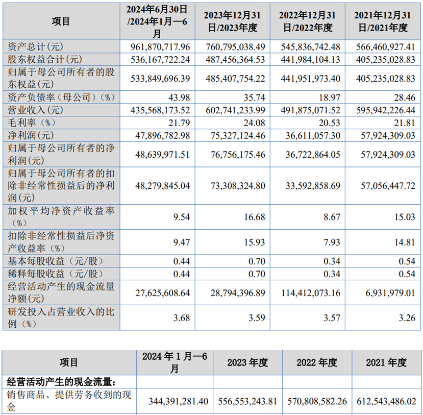 2021年至2024年1-6月,聚星科技的营业收入分别为595,942,226.44元、491,875,071.52元、602,741,233.99元和435,568,173.52元;净利润分别为57,924,309.03元、36,611,057.30元、75,327,124.46元和47,896,782.98元;归属于母公司所有者的净利润分别为57,924,309.03元、36,722,864.05元、76,756,175.46元和48,639,971.51元;归属于母公司所有者的扣非净利润分别为57,056,447.72元、33,592,858.69元、73,308,324.80元和48,279,845.04元。