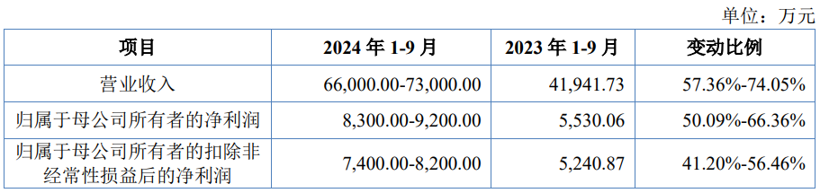 结合目前的订单情况、经营状况以及市场环境,聚星科技预计2024年1-9月营业收入约为66,000.00万元至73,000.00万元,同比增长幅度约为57.36%至74.05%;归属于母公司所有者的净利润约为8,300.00万元至9,200.00万元,同比增长幅度约为50.09%至66.36%;归属于母公司所有者的扣非净利润约为7,400.00万元至8,200.00万元,同比增长幅度约为41.20%至56.46%。