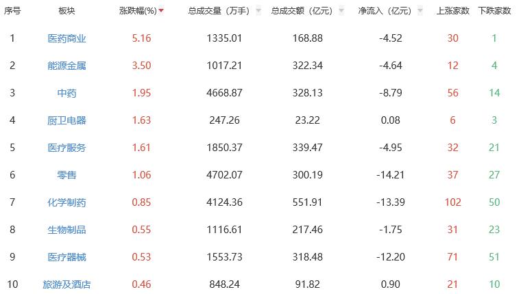 板块方面,医药商业、能源金属、中药、厨卫电器等涨幅居前,保险、军工电子、军工装备、非金属材料等跌幅居前。