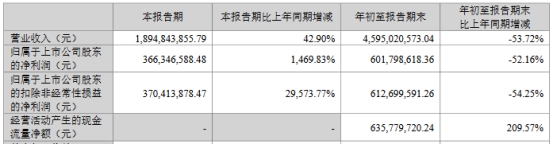 2024年前三季度,公司实现营业收入45.95亿元,同比下降53.72%;归属于上市公司股东的净利润6.02亿元,同比下降52.16%;归属于上市公司股东的扣除非经常性损益的净利润6.13亿元,同比下降54.25%;经营活动产生的现金流量净额6.36亿元,同比增长209.57%。