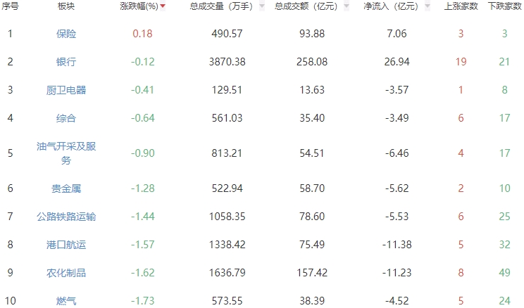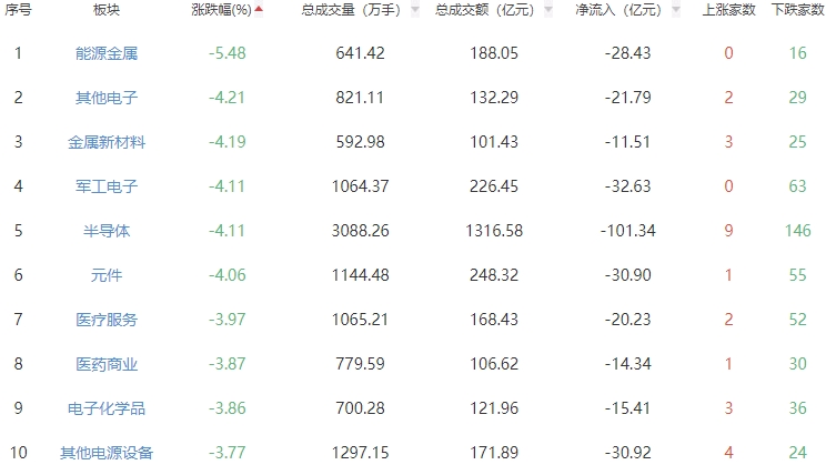板块方面,保险板块涨幅居前,能源金属、其他电子、金属新材料等板块跌幅居前。