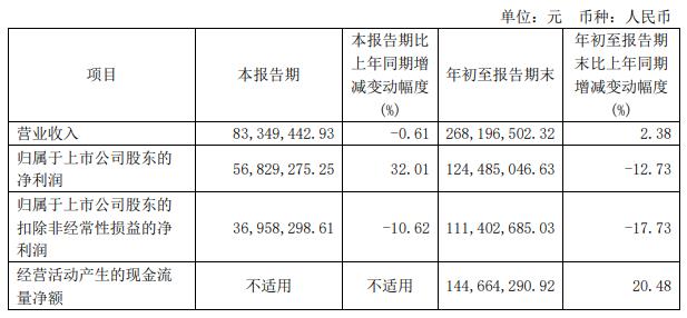 2024年前三季度,世茂能源实现营业收入2.68亿元,同比增长2.38%;归属于上市公司股东的净利润1.24亿元,同比下滑12.73%;归属于上市公司股东的扣除非经常性损益的净利润1.11亿元,同比下滑17.73%;经营活动产生的现金流量净额为1.45亿元,同比增长20.48%。