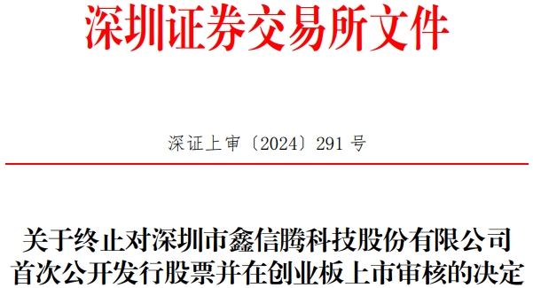 日前,鑫信腾向深交所提交了《关于撤回深圳市鑫信腾科技股份有限公司首次公开发行股票并在创业板上市申请文件的申请》,保荐人向深交所提交了《民生证券股份有限公司关于撤回深圳市鑫信腾科技股份有限公司首次公开发行股票并在创业板上市申请文件的申请》。根据《深圳证券交易所股票发行上市审核规则(2024年修订)》第六十二条的有关规定,深交所决定终止对鑫信腾首次公开发行股票并在创业板上市的审核。