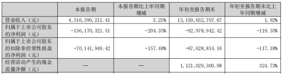 据万凯新材2024年第三季度报告,2024年第三季度,万凯新材实现营业收入45.16亿元,同比增长3.25%;归属于上市公司股东的净利润-1.36亿元;归属于上市公司股东的扣除非经常性损益的净利润-7014.19万元。