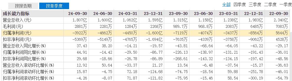 东芯股份目前已连续8个季度亏损。从2022年第四季度到2024年第三季度,东芯股份各季度归属于上市公司股东的净利润分别为-8564万元、-3437万元、-4074万、-7119万元、-1.6亿元、-4450万元、-4662万元、-3922万元;归属于上市公司股东的扣除非经常性损益的净利润分别为-9062万元、-3758万元、-4339万元、-7635万元、-1.694亿元、-4765万元、-5149万元、-5369万元。
