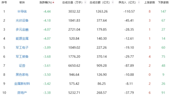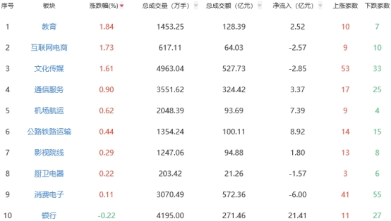 板块方面,教育、互联网电商、文化传媒等板块涨幅居前,半导体、光伏设备、多元金融等板块跌幅居前。