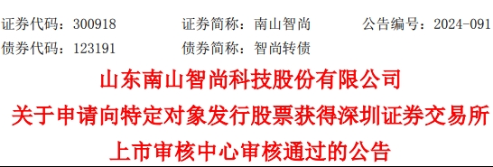 中国经济网北京11月18日讯 南山智尚(300918.SZ)昨晚公告称,公司于2024年11月16日收到深交所上市审核中心出具的《关于山东南山智尚科技股份有限公司申请向特定对象发行股票的审核中心意见告知函》,深交所发行上市审核机构对公司向特定对象发行股票的申请文件进行了审核,认为公司符合发行条件、上市条件和信息披露要求,后续深交所将按规定报中国证监会履行相关注册程序。