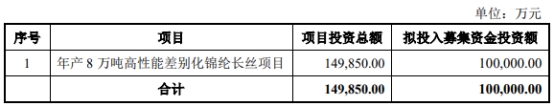 南山智尚2024年11月5日披露的向特定对象发行A股股票募集说明书(修订稿)显示,公司本次向特定对象发行股票募集资金总额不超过100,000.00万元(含本数),扣除发行费用后的募集资金净额将全部用于以下项目:年产8万吨高性能差别化锦纶长丝项目。