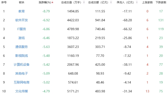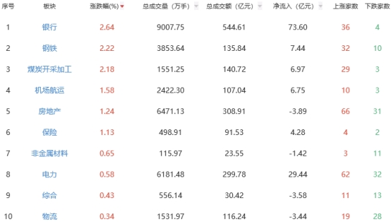 板块方面,银行、钢铁、煤炭开采加工、机场航运、房地产等板块涨幅居前,教育、软件开发、IT服务、游戏、通信服务等板块跌幅居前。
