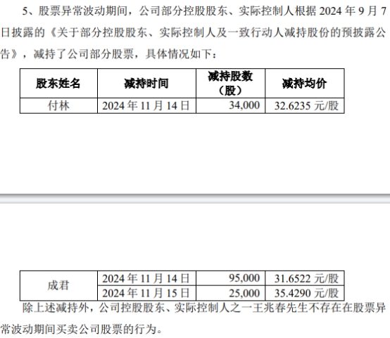 成君于11月14日减持95,000股,减持均价为31.6522元/股;于11月15日减持25,000股,减持均价为35.4290元/股。经计算,成君共减持12万股,减持金额389.27万元。