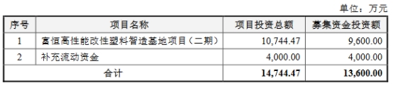 富恒新材此前披露的招股说明书显示,公司募集资金拟用于富恒高性能改性塑料智造基地项目(一期)、补充流动资金。