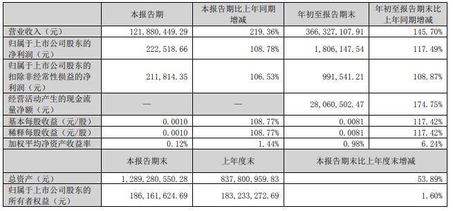 滨海能源2024年第三季度报告显示,2024年第三季度,滨海能源实现营业收入1.22亿元,同比增长219.36%;归属于上市公司股东的净利润22.25万元,同比增长108.78%;归属于上市公司股东的扣除非经常性损益的净利润21.18万元,同比增长106.53%。