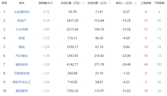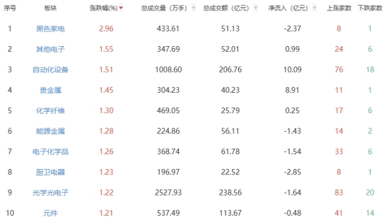 板块方面,黑色家电、其他电子、自动化设备等板块涨幅居前,非金属材料、房地产、文化传媒等板块跌幅居前。