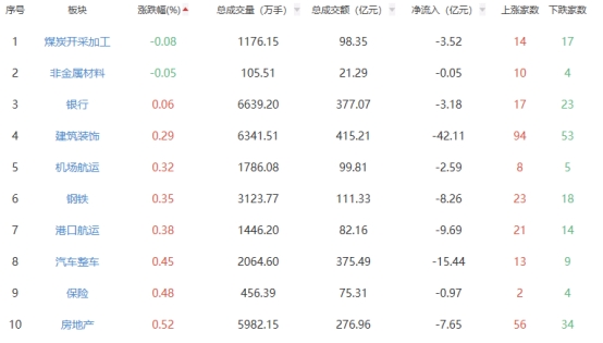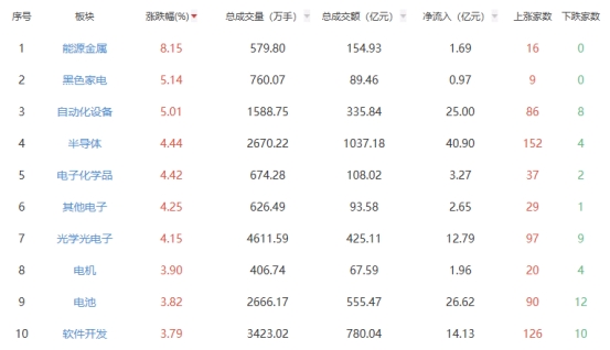 板块方面,能源金属、黑色家电、自动化设备等板块涨幅居前, 煤炭开采加工、非金属材料板块跌幅居前。