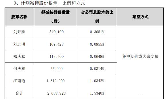 持有公司股份3,672,439股(占公司总股本比例2.0951%)的特定股东江西江南道企业管理有限公司(原深圳市江南道投资有限责任公司,简称“江南道”),计划在公告披露之日起3个交易日后的3个月内以集中竞价或大宗交易方式减持公司股份不超过1,812,900股(占公司总股本比例1.0342%)。
