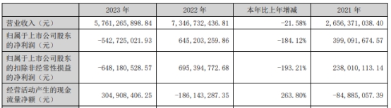 2023年,富临精工实现营业收入57.61亿元,同比下降21.58%;归属于上市公司股东的净利润-5.43亿元,2022年为6.45亿元;归属于上市公司股东的扣除非经常性损益的净利润-6.48亿元,2022年为6.95亿元;经营活动产生的现金流量净额3.05亿元,2022年为-1.86亿元。