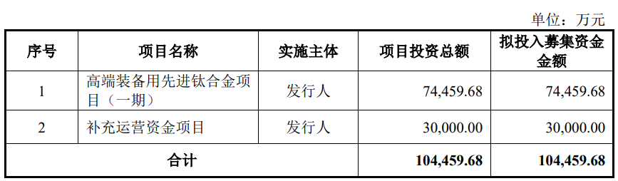金天钛业本次发行募集资金总额为66,230.00万元,扣除发行费用后募集资金净额为58,731.77万元,公司募集资金净额比原计划少45,727.91万元。金天钛业2024年11月14日披露的招股书显示,公司拟募集资金104,459.68万元,用于高端装备用先进钛合金项目(一期)、补充运营资金项目。