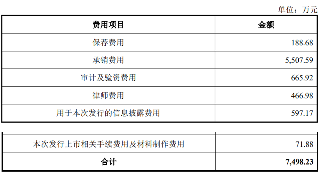 金天钛业本次公开发行新股的发行费用合计7,498.23万元(不含增值税金额),其中保荐费用188.68万元,承销费用5,507.59万元。