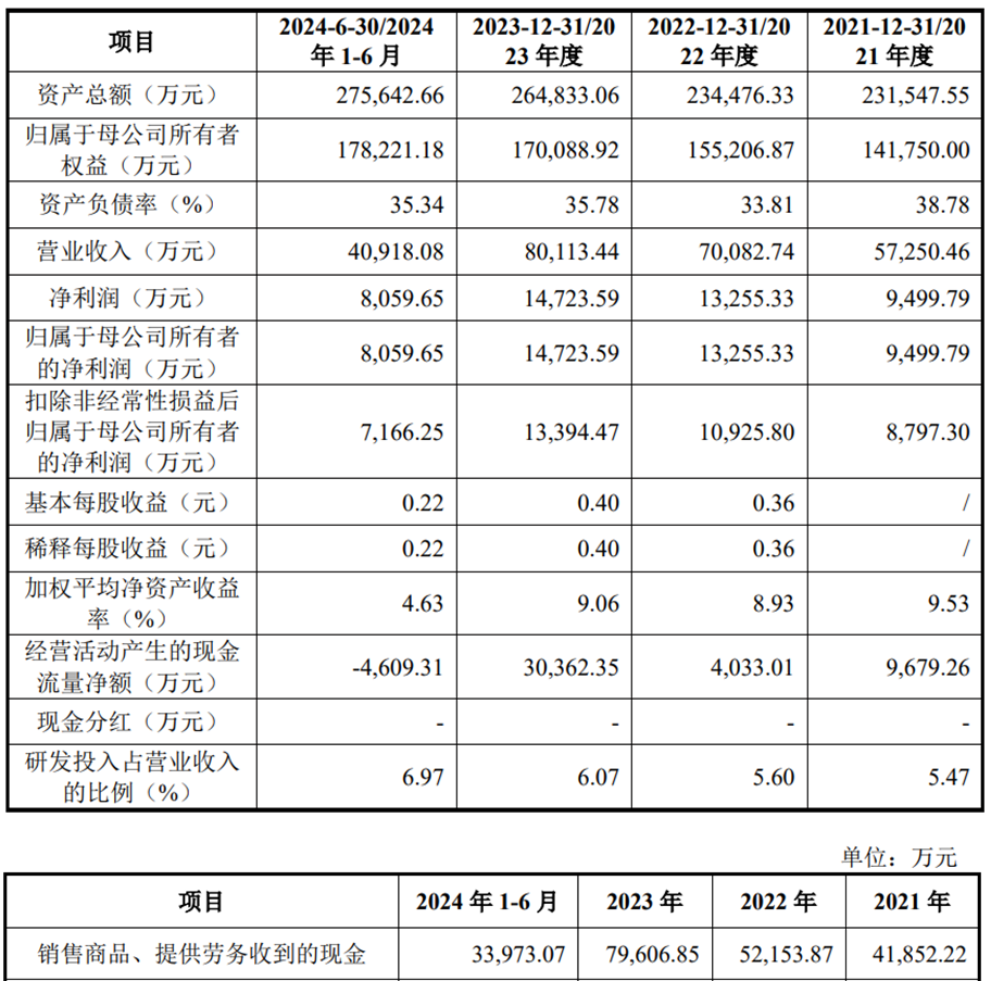2021年至2024年1-6月,金天钛业的营业收入分别为57,250.46万元、70,082.74万元、80,113.44万元和40,918.08万元;净利润/归属于母公司所有者的净利润分别为9,499.79万元、13,255.33万元、14,723.59万元和8,059.65万元;扣除非经常性损益后归属于母公司所有者的净利润分别为8,797.30万元、10,925.80万元、13,394.47万元和7,166.25万元。