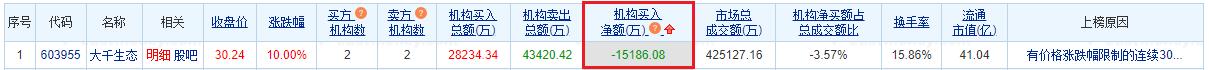 大千生态涨停 30个交易日机构净卖出1.52亿元