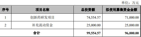 本次向特定对象发行股票募集资金总额不超过96,000.00万元(含本数),募集资金总额扣除相关发行费用后的净额将用于投资创新药研发项目、补充流动资金。