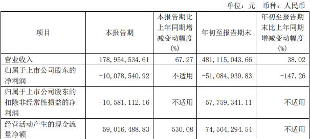 年初至报告期末,公司实现营业收入4.81亿元,同比增长38.02%;归属于上市公司股东的净利润-5108.49万元;归属于上市公司股东的扣除非经常性损益的净利润-5775.93万元;经营活动产生的现金流量净额为7456.43万元。