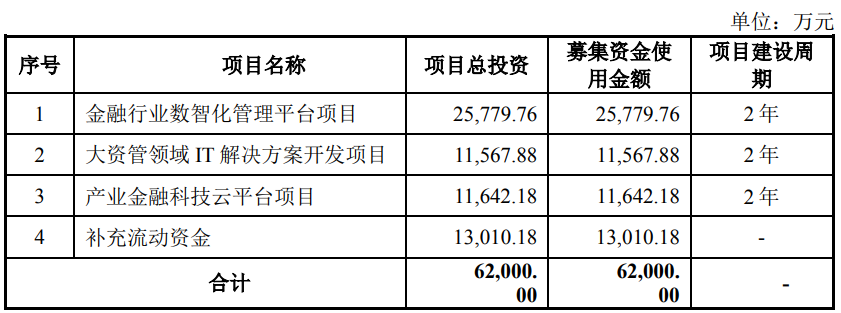 用友金融原拟在北交所公开发行股票不超过22,868,000股(未考虑超额配售选择权的情况);不超过26,298,200股(全额行使本次股票发行的超额配售选择权的情况)。公司原拟募集资金62,000.00万元,计划用于金融行业数智化管理平台项目、大资管领域IT解决方案开发项目、产业金融科技云平台项目、补充流动资金。