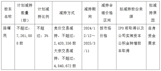 公告称,公司近日收到股东陈耀民的《关于股份减持计划的告知函》,因股东自身资金需求,陈耀民计划拟自公告披露之日起十五个交易日后的三个月内,通过集中竞价交易和大宗交易的方式合计减持其所持有的公司股份合计不超过7,261,008股,拟减持股份数量占公司总股本的比例合计不超过3%。其中,通过集中竞价交易方式减持不超过2,420,336股,占公司总股本比例不超过1%;通过大宗交易方式减持不超过4,840,672股,占公司总股本比例不超过2%。上述股份减持价格按减持实施时的市场价格确定。