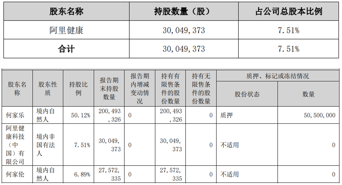 阿里健康持有华人健康股份30,049,373股,占公司总股本的比例为7.51%。华人健康2023年年报显示,阿里健康为公司第二大股东。