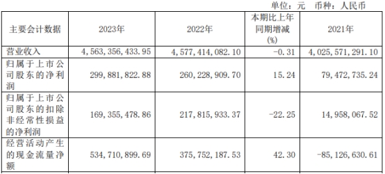 2023年,湘电股份实现营业收入45.63亿元,同比下降0.31%;归属于上市公司股东的净利润3.00亿元,同比增长15.24%;归属于上市公司股东的扣除非经常性损益的净利润1.69亿元,同比下降22.25%;经营活动产生的现金流量净额5.35亿元。