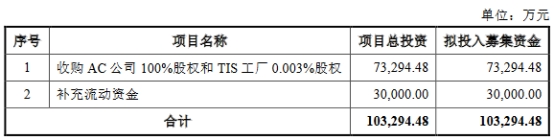光弘科技本次发行股票募集资金总额不超过103,294.48万元(含本数),扣除发行费用后的募集资金净额将全部用于“收购AC公司100%股权和TIS工厂0.003%股权”“补充流动资金”。