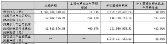 今年前三季度,公司营业收入51.78亿元,同比增长49.91%;归属于上市公司股东的净利润1.49亿元,同比下降37.37%;归属于上市公司股东的扣除非经常性损益的净利润1.22亿元,同比下降43.51%;经营活动产生的现金流量净额10.70亿元,同比增长66.03%。