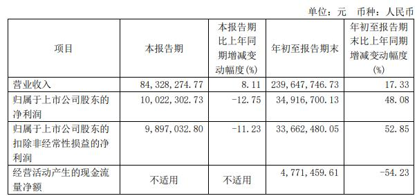 年初至报告期末,公司实现营业收入2.40亿元,同比增长17.33%;归属于上市公司股东的净利润3491.67万元,同比增长48.08%;归属于上市公司股东的扣除非经常性损益的净利润3366.25万元,同比增长52.85%;经营活动产生的现金流量净额为477.15万元,同比减少54.23%。