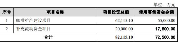 本次发行募集资金总额为不超过人民币72,500.00万元(含本数),扣除发行费用后的募集资金净额将用于咖啡扩产建设项目、补充流动资金项目。