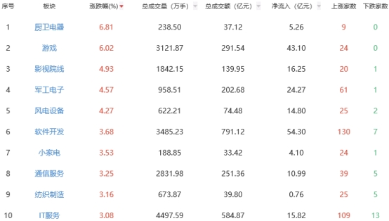 板块方面,厨卫电器、游戏、影视院线、军工电子等板块涨幅居前,石油加工贸易、贵金属 、化学原料、油气开采及服务等板块跌幅居前。