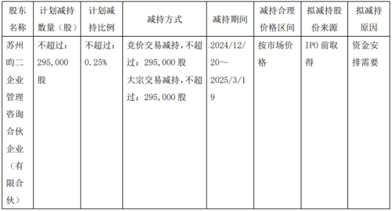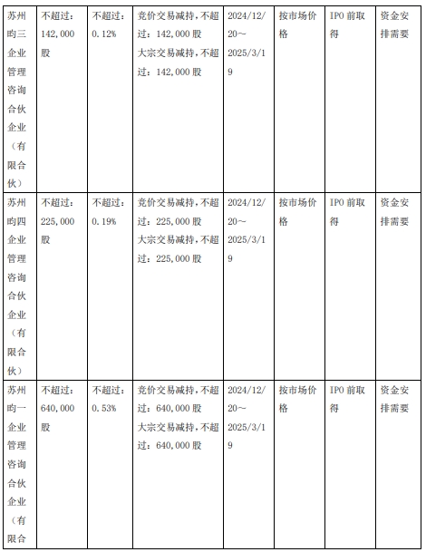 据昀冢科技公告,因持股平台员工的资金需求,苏州昀二、苏州昀三、苏州昀四、苏州昀一计划通过集中竞价、大宗交易方式减持其所持有的公司股份合计不超过1,302,000股,拟减持股份占公司总股本的比例约为1.09%,其中,以集中竞价方式减持不超过1,200,000股(不超过公司股份总数的1.00%),以大宗交易方式减持不超过1,302,000股(不超过公司股份总数的1.09%)。本次减持计划自公告披露之日起15个交易日后的3个月内进行。
