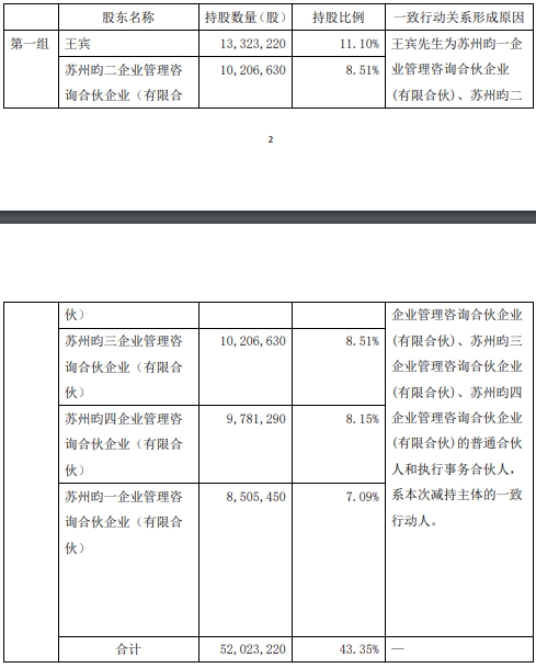 苏州昀二、苏州昀三、苏州昀四、苏州昀一分别持有公司股份10,206,630股、10,206,630股、9,781,290股、8,505,450股,分别占公司总股本8.51%、8.51%、8.15%、7.09%,均为公司首次公开发行前取得的股份,且已于2024年4月8日起上市流通。