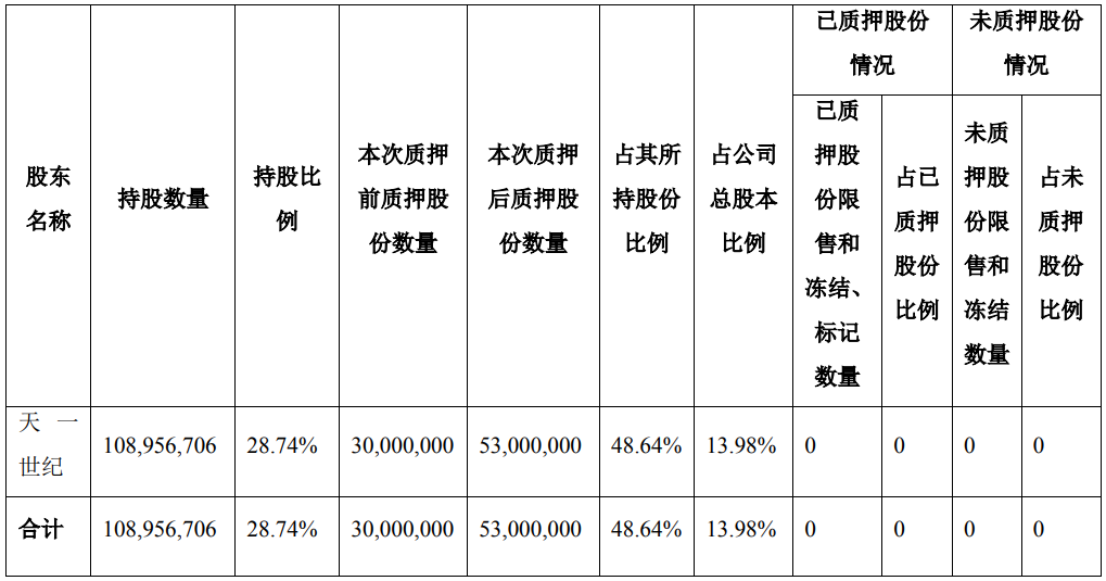 截至公告披露日,天一世纪持有公司股份108,956,706股,占公司目前总股本(剔除公司回购专用账户所持股份)的30.00%。公司实际控制人周方洁持有天一世纪51.8%股权,并直接持有公司股份18,642,721股。天一世纪、周方洁合计持有公司总股本(剔除公司回购专用账户所持股份)的35.14%。