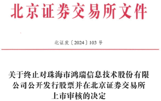 2024年7月31日,珠海鸿瑞向北交所提交了《珠海市鸿瑞信息技术股份有限公司关于撤回公开发行股票并在北京证券交易所上市申请文件的申请》,申请撤回申请文件。根据《北京证券交易所向不特定合格投资者公开发行股票并上市审核规则》第五十五条的有关规定,北交所决定终止珠海鸿瑞公开发行股票并在北交所上市的审核。