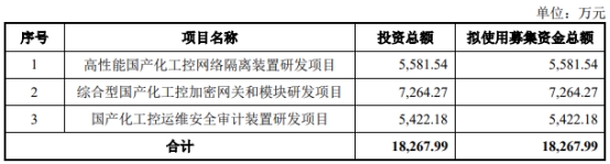 珠海鸿瑞原拟募资18,267.99万元,用于高性能国产化工控网络隔离装置研发项目、综合型国产化工控加密网关和模块研发项目、国产化工控运维安全审计装置研发项目。