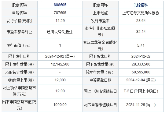 先锋精科2024年11月29日披露的首次公开发行股票并在科创板上市发行公告显示,按本次发行价格11.29元/股和5,059.5000万股的新股发行数量计算,若本次发行成功,预计公司募集资金总额57,121.76万元,扣除约5,899.32万元(不含税)的发行费用后,预计募集资金净额51,222.43万元。