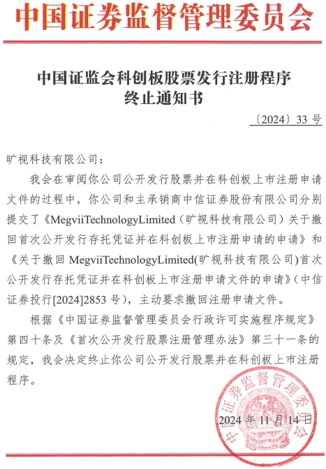 中国证监会在审阅旷视科技公开发行股票并在科创板上市注册申请文件的过程中,旷视科技和主承销商中信证券股份有限公司分别提交了《Megvii Technology Limited(旷视科技有限公司)关于撤回首次公开发行存托凭证并在科创板上市注册申请的申请》和《关于撤回Megvii Technology Limited(旷视科技有限公司)首次公开发行存托凭证并在科创板上市注册申请文件的申请》(中信证券投行[2024]2853号),主动要求撤回注册申请文件。