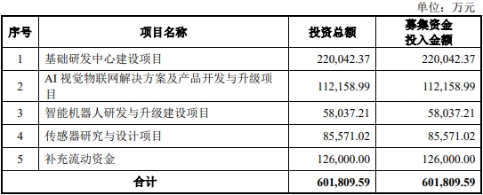 旷视科技原拟募集资金601,809.59万元,分别用于基础研发中心建设项目、AI视觉物联网解决方案及产品开发与升级项目、智能机器人研发与升级建设项目、传感器研究与设计项目和补充流动资金。