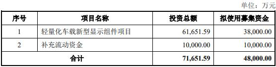 本次向特定对象发行股票募集资金总额不超过48,000.00万元(含本数),扣除发行费用后的净额将全部用于轻量化车载新型显示组件项目、补充流动资金。