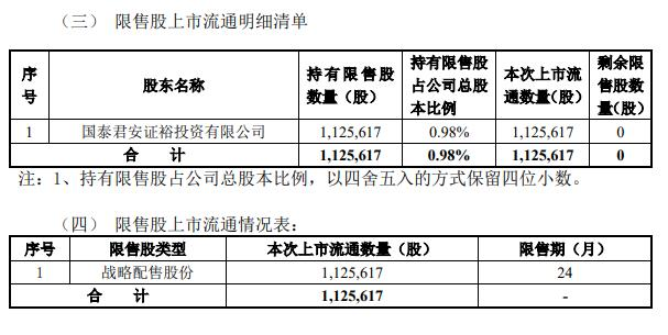 中国经济网北京12月2日讯 三未信安(688489.SH)11月22日晚披露《首次公开发行部分战略配售限售股上市流通的公告》,本次上市流通的限售股为首次公开发行战略配售限售股,涉及战略配售限售股股东1名,系公司首次公开发行股票保荐机构国泰君安证券股份有限公司子公司国泰君安证裕投资有限公司跟投获配股份以及限售期间实施公积金转增增加的股份,对应的股份数量为1,125,617股,占公司股本总数的0.98%。该部分限售股份限售期为自公司股票上市之日起24个月,现限售期即将届满,将于2024年12月2日起上市流通。