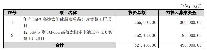 TCL中环向不特定对象发行可转换公司债券预案(修订稿)显示,本次发行可转债拟募集资金不超过人民币490,000万元(含490,000万元),扣除发行费用后将全部用于年产35GW高纯太阳能超薄单晶硅片智慧工厂项目、12.5GWN型TOPCon高效太阳能电池工业4.0智慧工厂项目。